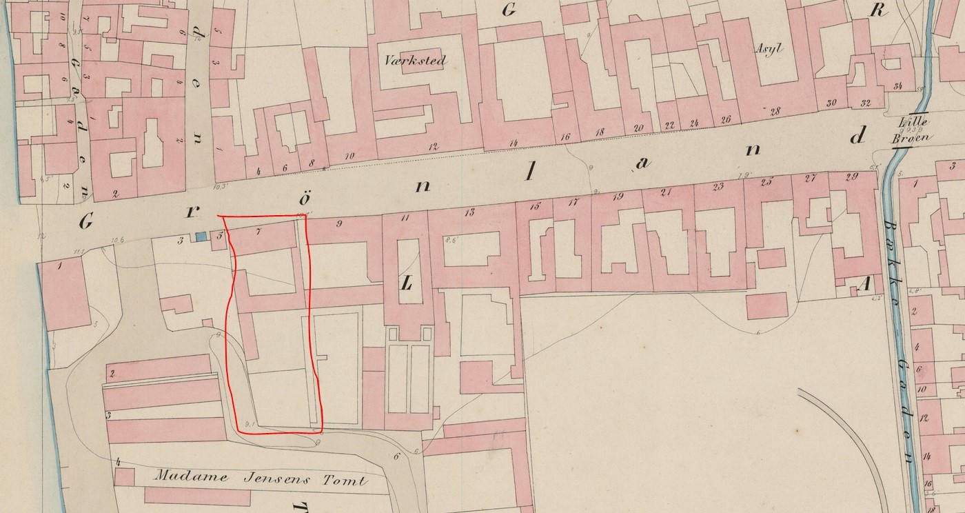 Senere i artikkelen sin plasserer «Økonom» Frysju Hal til Grønland nummer 7. På kartet fra 1860 er Grønland nummer 7 markert med rød innramming.